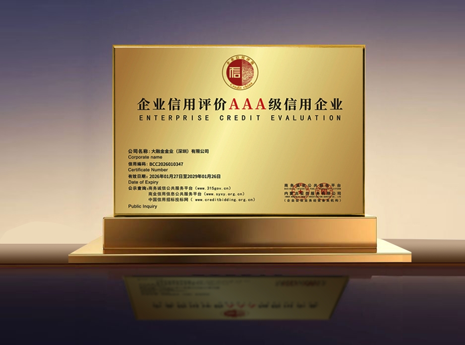 近日,经央行备案信用评级机构综合评估,深圳大融金金业有限公司正式获评“AAA级信用企业”荣誉称号。该认证从企业履约能力、经营稳定性、社会责任履行及客户信誉等多个维度进行严格审核,是对大融金长期坚持诚信经营、规范管理与优质服务的高度认可。